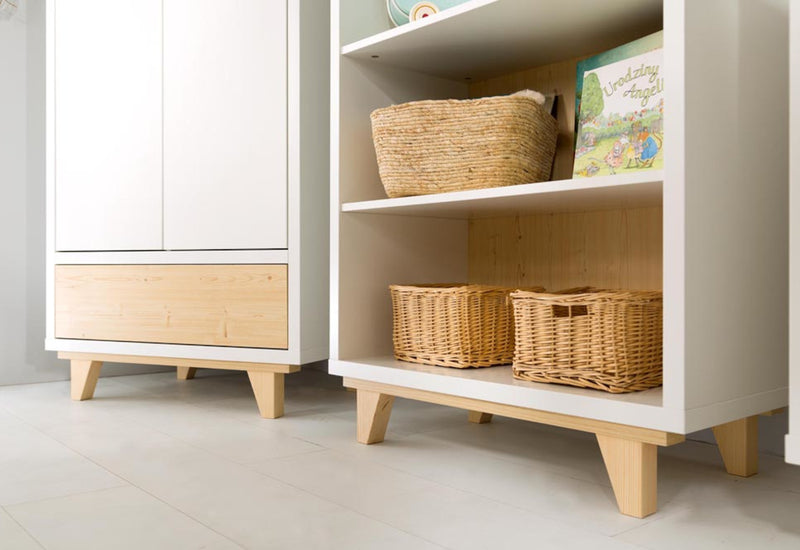 Detský regál RIA. Elegantný detský regál zaujme jednoduchými líniami škandinávskeho štýlu. Detský regál je vyrobený z kvalitného laminového dreva. Postarajú sa o to odolné materiály a starostlivo spracované detaily. Detský regál stojí na vyšších drevených nohách, ktoré dodajú regálu stabilitu a vzdušnosť. Detský regál má veľmi zaujímavý dizajn, ktorý si zaručene obľúbite. Možnosť zakúpenia ďalších produktov z radu RIA.