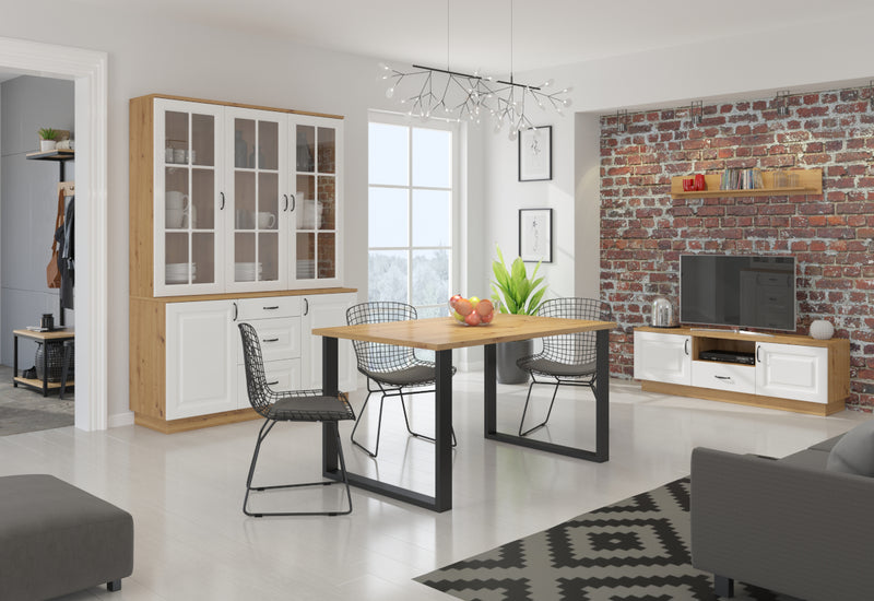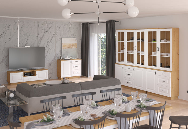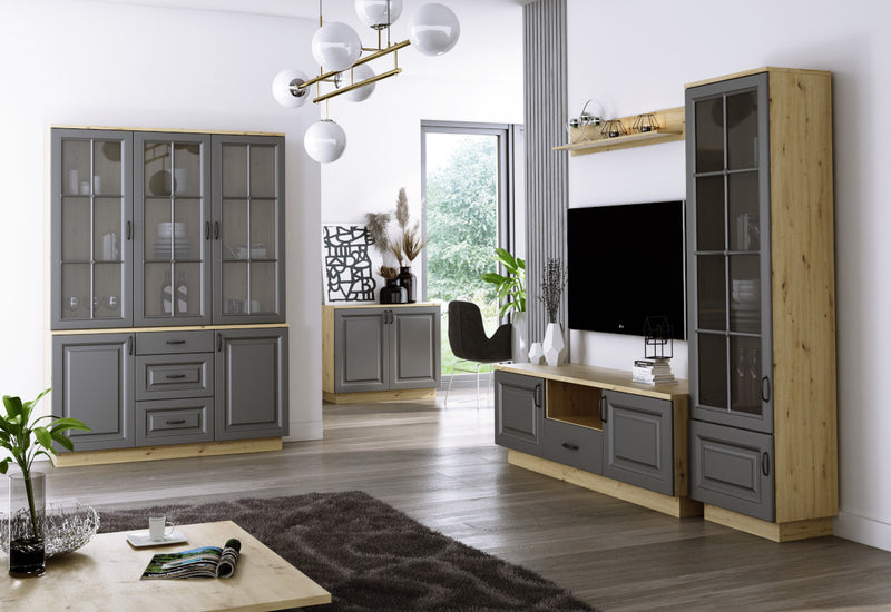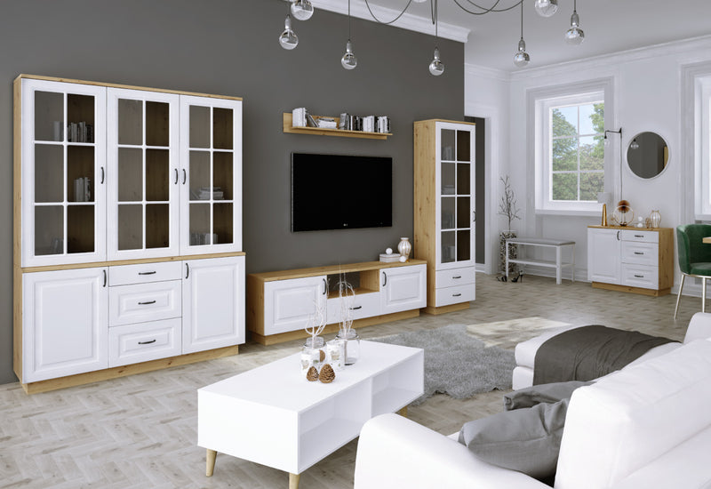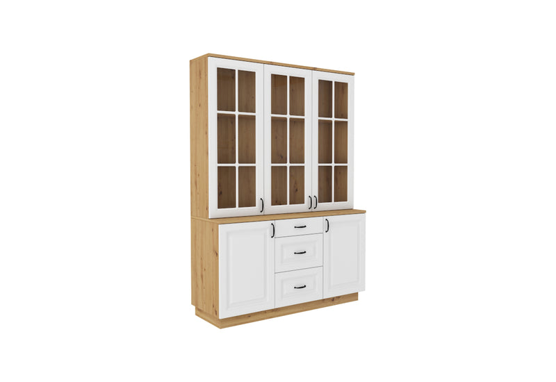 Horný nadstavec FLAVELA 2. Štýlový horný nadstavec v škandinávskom vzhľade. Vyrobený je z kvalitného materiálu s hrúbkou 1,6 cm. Súčasťou nástavca sú tri presklené skrinky s policami. Presklené dvierka vyzerajú vkusne a zvláštny interiér, majú jemné kovové úchytky. Vybrať môžete z viacerých dekorov. Doporučujeme kombinovať s ďalšími produktmi z radu FLAVELA.