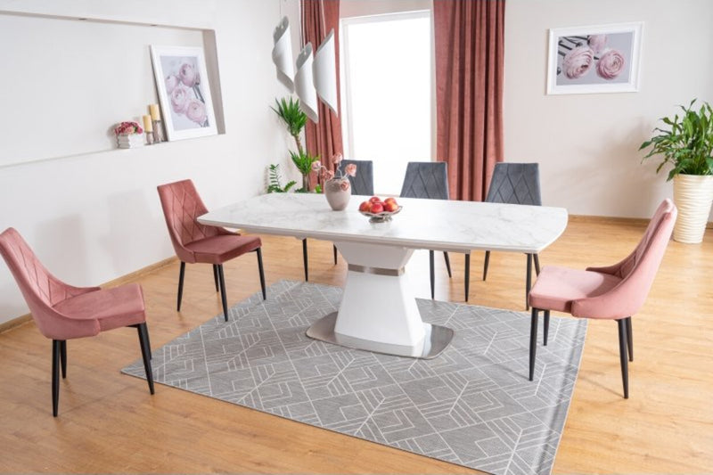 Jedálenská stolička TRICK Velvet B Vás očarí svojím originálnym vzhľadom a eleganciou. Nohy stoličky sú vyrobené z kovu v čiernej matnej farbe. Dodávajú jej požadovanú stabilitu a pevnosť. Pohodlné sedáky sú potiahnuté zamatovo hebkú látkou. Prešívané operadlo vyzerá nadčasovo a minimalisticky.