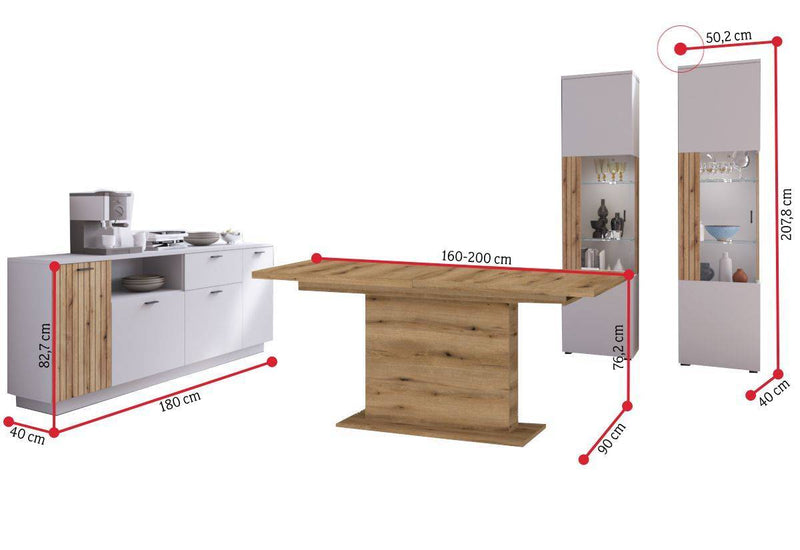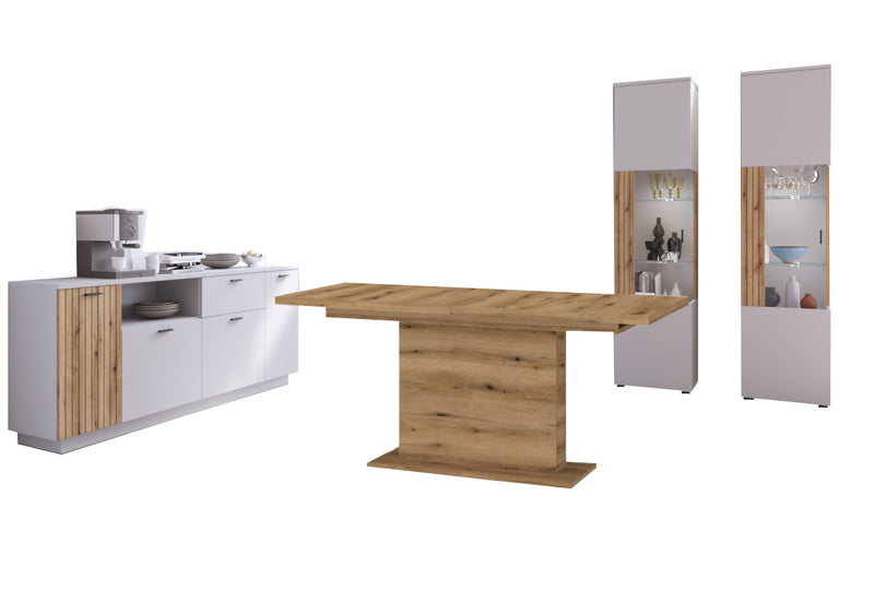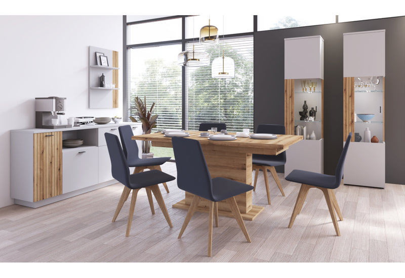 Jedálenská zostava ALVERA. Zaujme Vás jednoduchými líniami modernej jedálenskej zostavy. Je vyrobená z kvalitných materiálov. Zostava sa skladá z dvoch vysokých vitrín, jednej komody a jedálenského stola. Vďaka tomu získate dostatok úložného priestoru. Komoda a vitríny stoja na nižších nožičkách, ktoré dodávajú pevnosť a stabilitu. Stoličky nie sú súčasťou zostavy. Dvierka obsahujú úchytky, pre ľahšie otváranie. Zostavu môžete doplniť ďalšími produktmi z radu ALVERA.