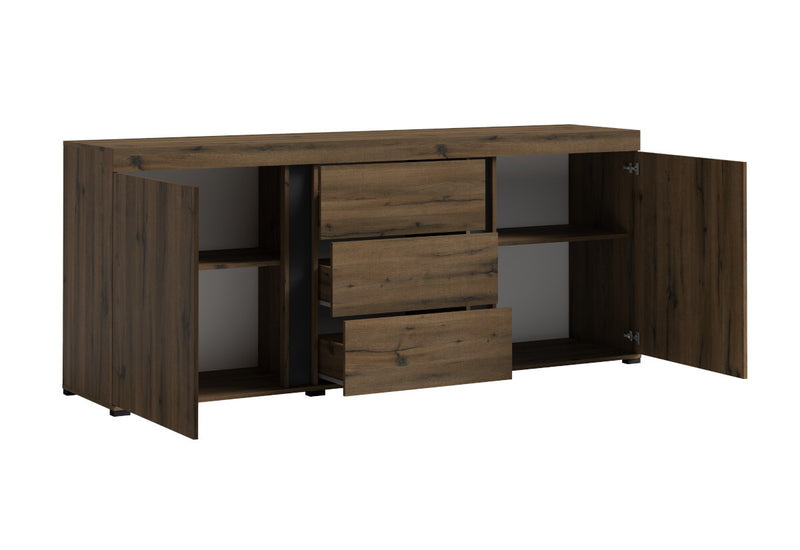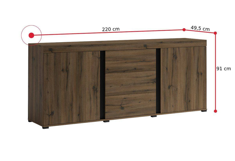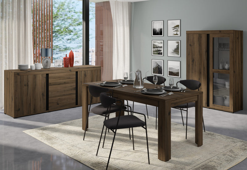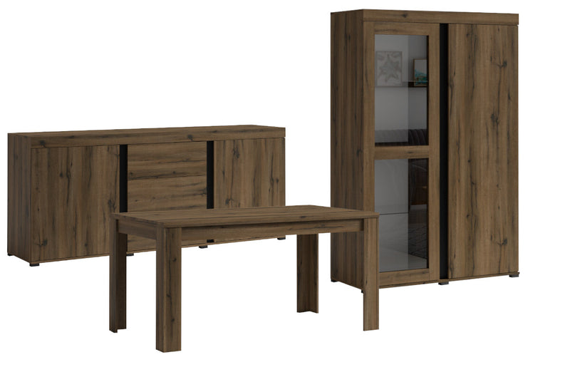 Jedálenská zostava AVINON. Zaujme moderným dizajnom a kvalitným spracovaním. Je vyrobená z kvalitného materiálu a opatrená ABS hranami, ktoré chránia pred mechanickým poškodením a vlhkosťou. Zostava ponúka množstvo úložného priestoru. Súčasťou zostavy je vitrína, priestranná komoda a jedálenský stôl. Kombinovať môžete s ďalšími produktmi z radu AVINON.
