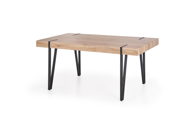 Jedálenský stôl ALEXIA. Zaujme industriálnym vzhľadom. Doska stola poskytuje dostatok priestoru, vyrobená je z kvalitného lamina v dekore dub san remo a je ošetrená ABS hranou. Tá chráni dosku pred mechanickým poškodením a vlhkosťou. Držia ju štyri kovové nohy v netradičnom prevedení, ktoré poskytujú dostatočnú stabilitu celému stolu.