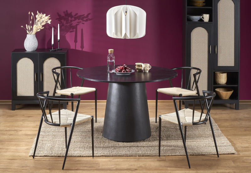 Jedálenský stôl CAHIR. Elegantný a zároveň moderný jedálenský stôl. Okrúhla doska stola je vyrobená z kvalitnej dyhovanej MDF dosky v čiernom dekore. Robostné podnož zaisťuje stabilitu a pevnosť. Vďaka netradičnému vzhľadu sa ľahko stane dominantou každej kuchyne či jedálne.
