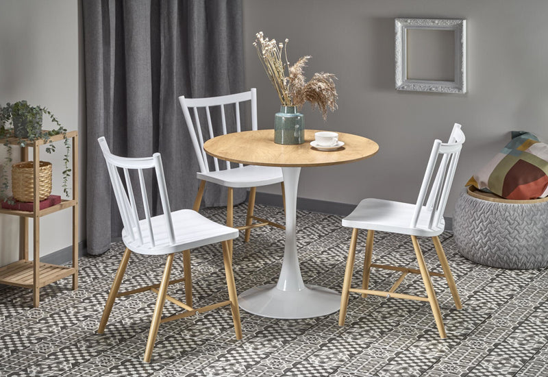 Jedálenský stôl SIEBEL. Jednoduché a elegantné prevedenie. Doska stola poskytuje dostatok priestoru, vyrobená je z kvalitného dyhovaného lamina v dekore zlatého duba. Okrúhly stôl stojí na kovovom podstavci v bielej farbe. Vďaka svojim rozmerom je vhodný aj do menších priestorov.