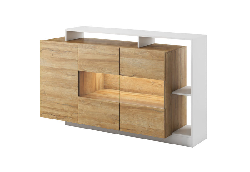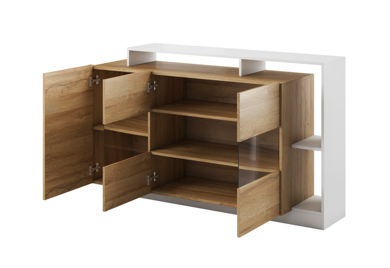 Komoda ALMEN. Zaujme moderným dizajnom a kvalitným spracovaním. Je vyrobená z kvalitného materiálu a opatrená ABS hranami, ktoré chránia pred mechanickým poškodením a vlhkosťou. Komoda ponúka množstvo úložného priestoru v podobe dvoch skriniek s dvierkami, skrinky sú rozdelené policou. Časť dvierok komody je presklená. Kombinovať môžete s ďalšími produktmi z radu ALMEN.