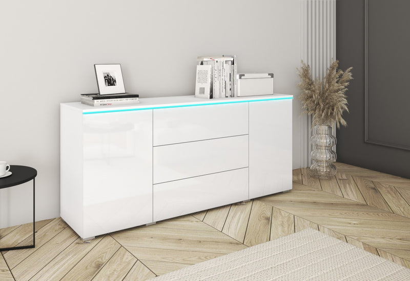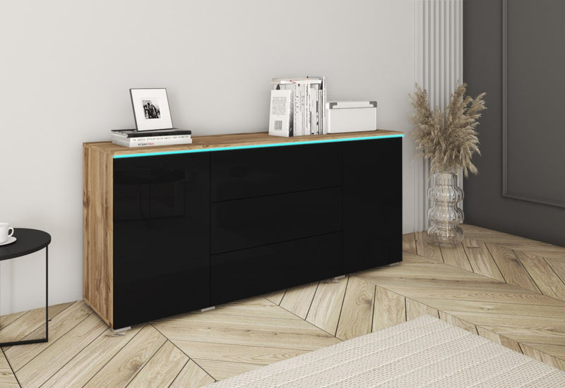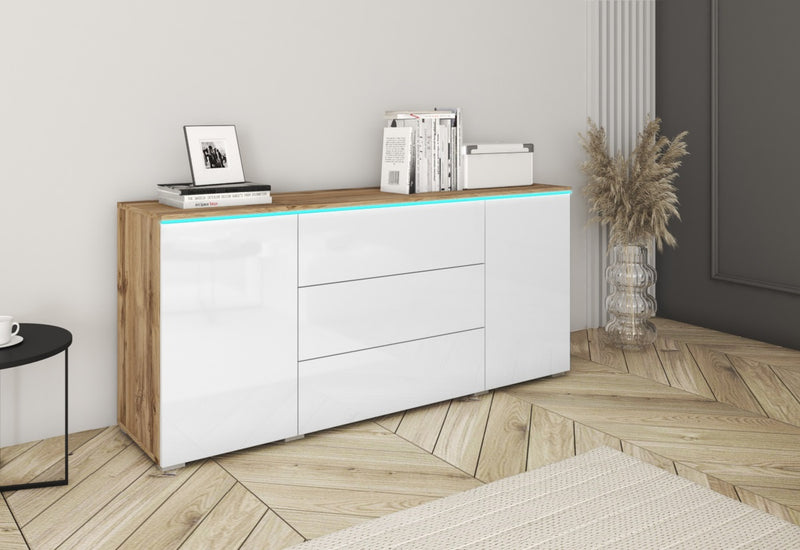Komoda AMALIE. Vyrobená je z kvalitného materiálu s ABS hranami. Hrany chránia materiál pred mechanickým poškodením a vlhkosťou. Komoda poskytuje dostatok úložného priestoru v podobe troch priestranných zásuviek a dvoch skriniek s dvierkami. Skrinky sú rozdelené policou pre prehľadnejšie usporiadanie. Dvierka skriniek aj zásuviek nemajú úchytky. Otvárajú sa pomocou systému PUSH TO OPEN. Stojí na nízkych nožičkách. Vybrať si môžete z viacerých dekorov s možnosťou LED osvetlenia.