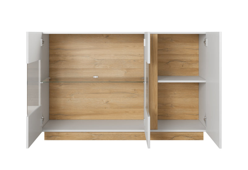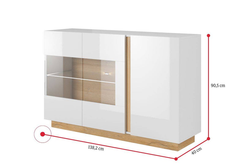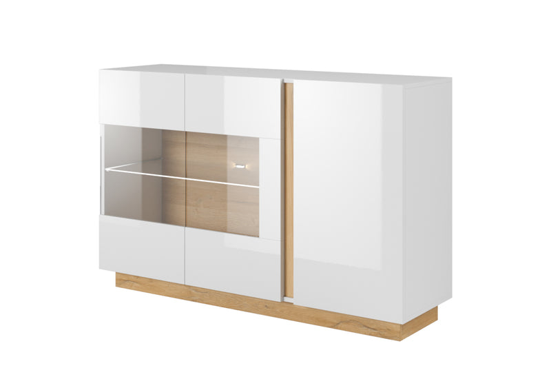Komoda ARMONA 2. Zaujme moderným dizajnom a kvalitným spracovaním. Vyrobená je z kvalitných materiálov a opatrená ABS hranami, ktoré chránia pred mechanickým poškodením a vlhkosťou. Komoda ponúka množstvo úložného priestoru v podobe dvoch skriniek s dvierkami, skrinky sú rozdelené policou. Časť dvierok komody je presklená. Na otváranie slúži obľúbený systém PUSH TO OPEN. Korpus pri bielom dekore je v matnom prevedení, zatiaľ čo predná strana v lesku. Možnosť výberu z dvoch dekorov. Kombinovať môžete s ďalšími produktmi z radu ARMONA.