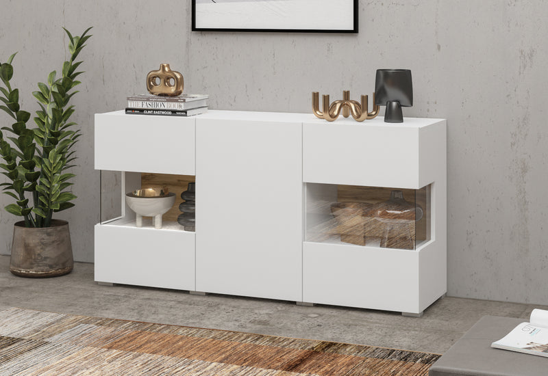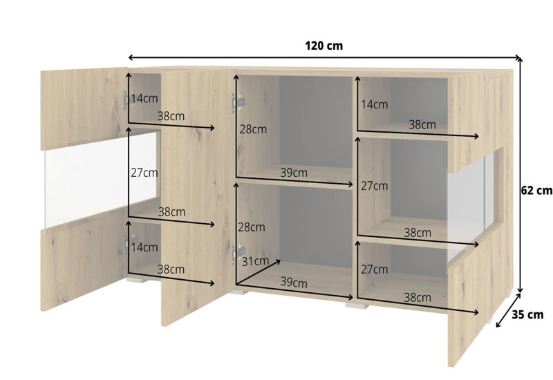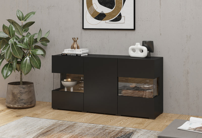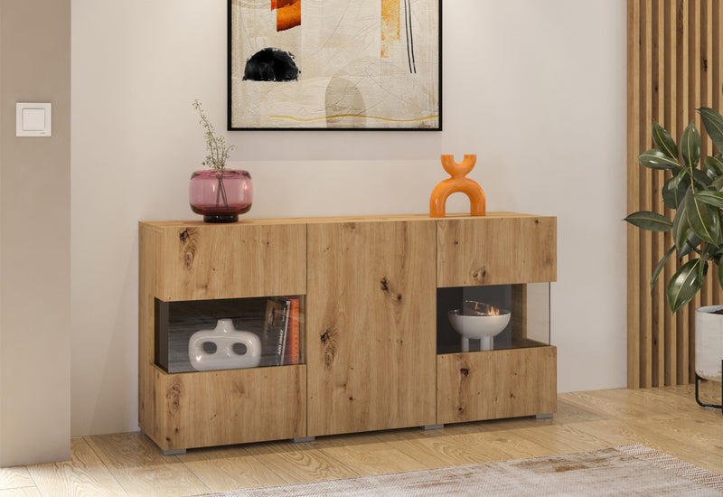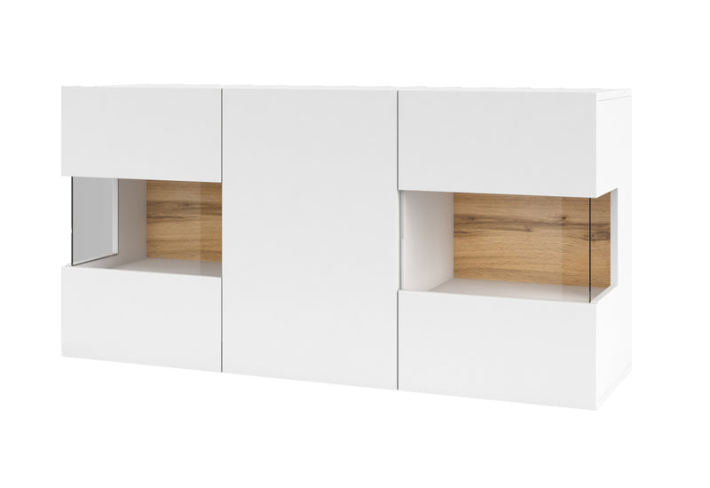 Komoda AVANA 3D. Moderná komoda je vyrobená z kvalitného materiálu. Komoda poskytuje dostatok úložného priestoru, ktorý je ukrytý za dvierkami a je rozdelený policami. Dvoje dvierka sú čiastočne preslávené. Dvierka komody sú bez úchytov. Možnosť zakúpiť aj s LED osvetlením. Na výber viac dekoru.