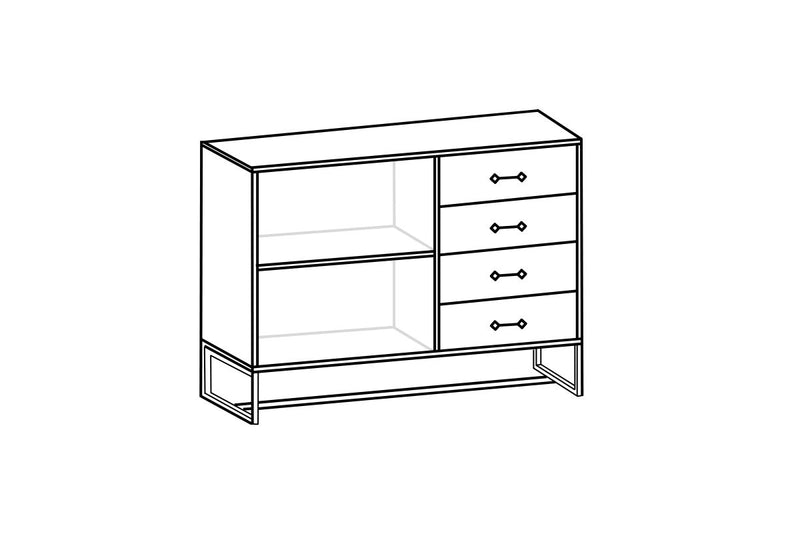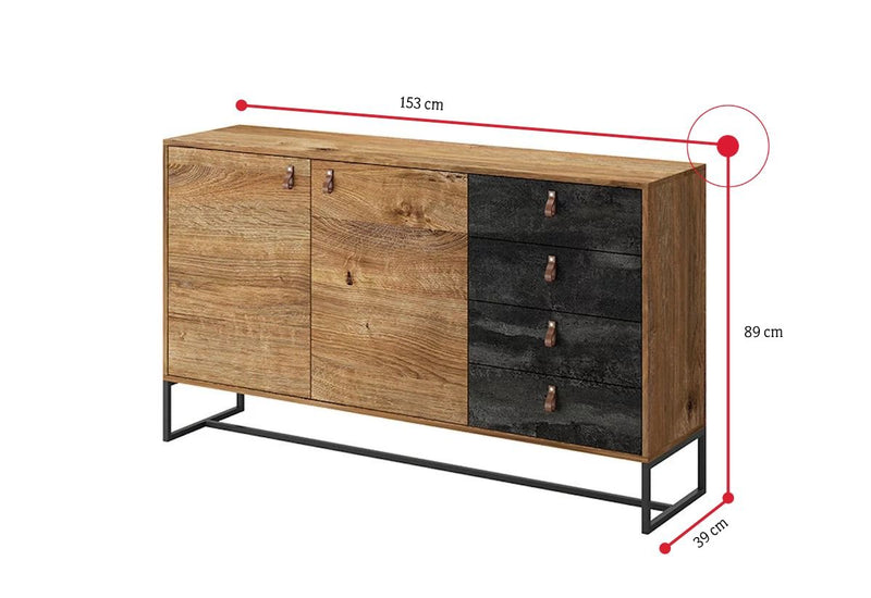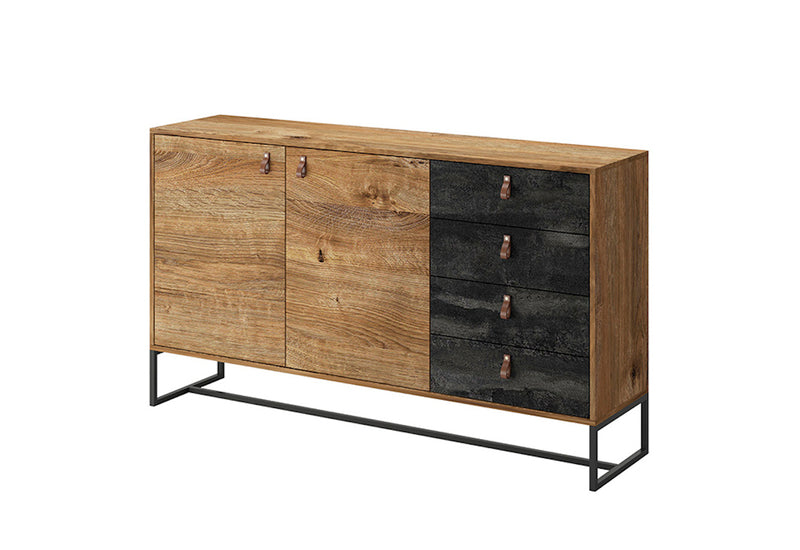 Komoda BRUNO DK 153. Moderný dizajn kombinovaný dvoma dekory na kovových nožičkách. Dvierka s koženými úchytmi a mosadzným kovaním. Je vyrobený z kvalitného materiálu hrúbky 1,6 cm. Opatreného ABS hranami, ktoré ochráni pred možným mechanickým poškodením a vlhkosťou. Komoda ponúkne štyri zásuvky a dvoje dvierka.