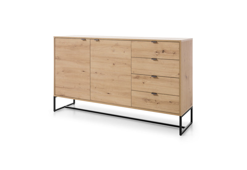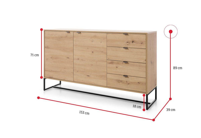 Komoda CHAMBER. Vyrobená je z kvalitného materiálu s hrúbkou 1,6 cm. Vybavená ABS hranami, ktoré chránia pred mechanickým poškodením a vlhkosťou. Komoda poskytuje dostatok úložného priestoru v podobe štyroch priestranných zásuviek a dvoch skriniek s dvierkami. Skrinky sú rozdelené policou pre prehľadnejšie usporiadanie vecí. Zásuvky aj dvierka skriniek sú opatrené úchytmi pre ľahšiu manipuláciu. Komoda stojí na vyšších nožičkách pre väčšiu stabilitu.