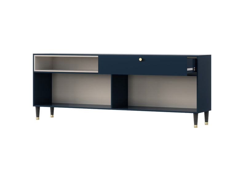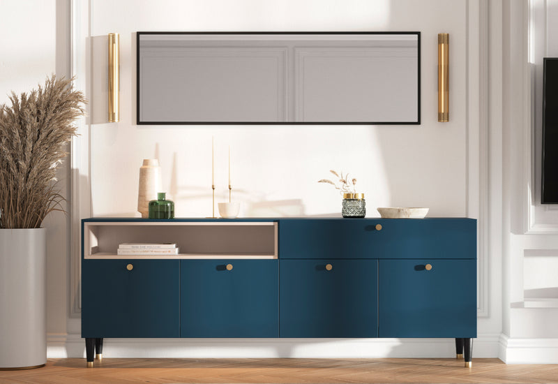 Komoda CLUDO. Moderná štýlová komoda je vyrobená z kvalitného materiálu o sile 1,6 s ABS hranami. Súčasťou komody je úložný priestor v podobe troch priestranných skriniek s uzatvárateľnými dvierkami, zásuvky a otvorené police. Vybavená je zlatými úchytmi pre ľahšiu manipuláciu. Stojí na vysokých kovových nohách pre väčšiu stabilitu. K dispozícii sú aj ďalšie produkty z rovnakého radu CLUDO.
