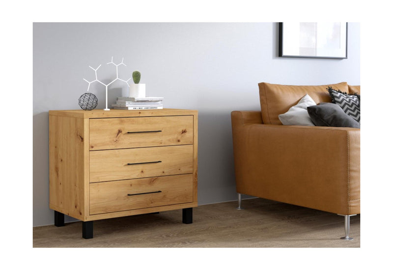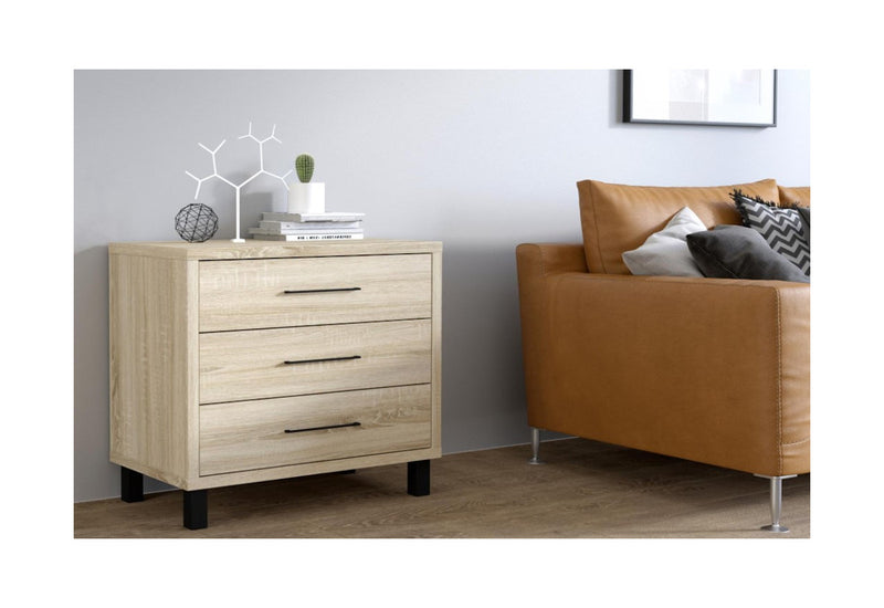 Komoda COLONNA 3S. Je vyrobená z kvalitného materiálu s ABS hranou. Zaujme sojim moderným dizajnom. Ponúka úložný priestor v troch zásuvkách s praktickými kovovými úchytmi v čiernej farbe. K dispozícii je v niekoľkých farebných prevedeniach.