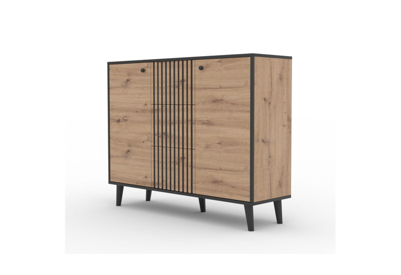 Komoda DAFI. Komoda v modernom štýle je vyrobená z kvalitnej dosky s hrúbkou 1,6 cm. Poskytuje dostatok úložného priestoru v podobe troch zásuviek a dvoch skriniek s dvierkami. Pre odkladací priestor môžete využiť hornú dosku komody. Dvierka a šuplíky skrine sú opatrené úchytmi pre ľahšiu manipuláciu. Komoda je vďaka vyšším nožičkám pevná a stabilná. Možnosť výberu farieb.