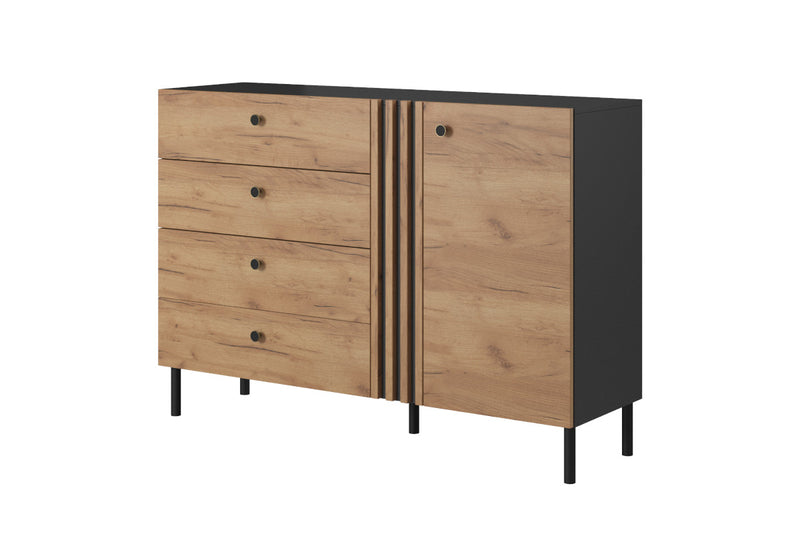 Komoda DELCA. Zaujme moderným dizajnom a kvalitným spracovaním. Je vyrobená z kvalitného materiálu a opatrená ABS hranami, ktoré chránia pred mechanickým poškodením a vlhkosťou. Komoda ponúka množstvo úložného priestoru v podobe skrinky s dvierkami a štyroch zásuviek, skrinka je rozdelená policou. Komoda stojí na čiernych kovových nožičkách. Dvierka skrinky sú opatrené malými úchytmi. Kombinovať môžete s ďalšími produktmi z radu DELCA.