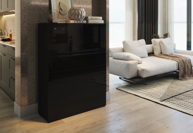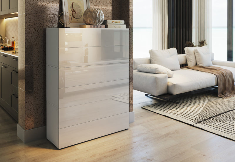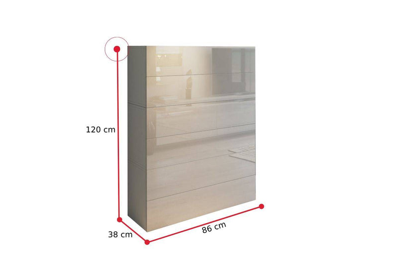 Komoda ELPASO 38. Je vyrobená z vysokokvalitného materiálu s hrúbkou 16 mm a chránená hranou ABS, ktorá chráni materiál pred mechanickým poškodením a vlhkosťou. Komoda je rozdelená na šesť širokých zásuviek. Zásuvky sú bez úchytiek a otvárajú sa systémom "PUSH TO OPEN". Môžete si vybrať z dvoch dekorov.