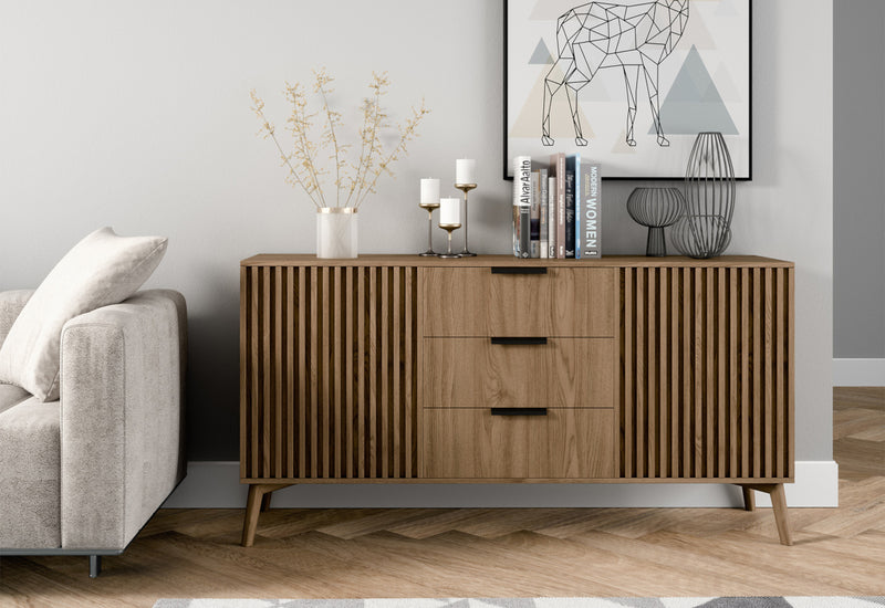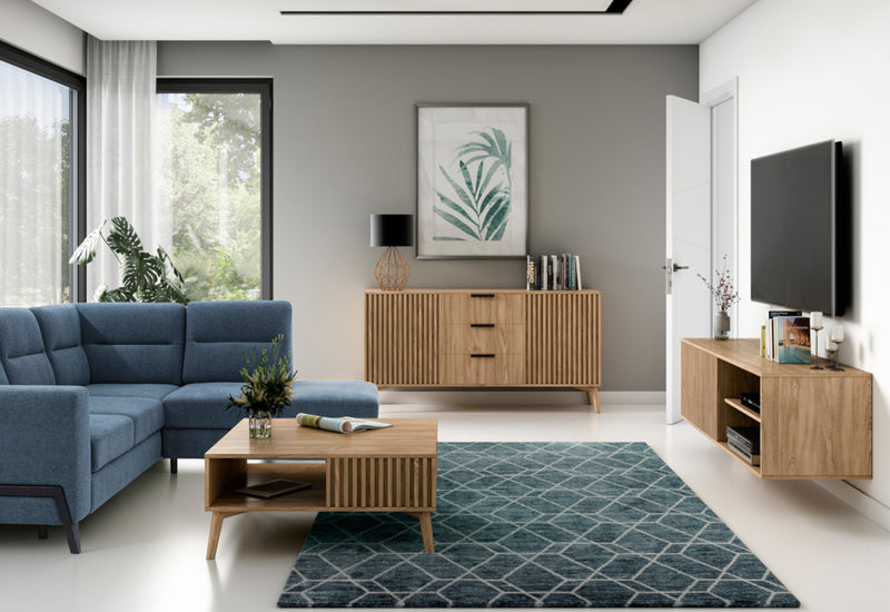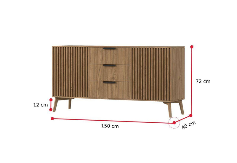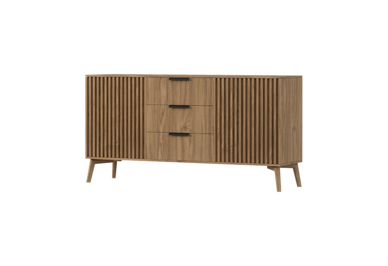 Komoda ETSIAN. Je vyrobená z kvalitného materiálu. Pevná konštrukcia z kvalitnej dosky opatrená ABS hranami zaistí stabilitu a odolnosť proti poškodeniu. Komoda poskytuje dostatok úložného priestoru v podobe troch šuplíkov a dvoch skriniek. Zásuvky majú úzke čierne úchyty. Čelá dvierok sú zdobené frézovanými detailmi. Komoda stojí na vyšších nožičkách.