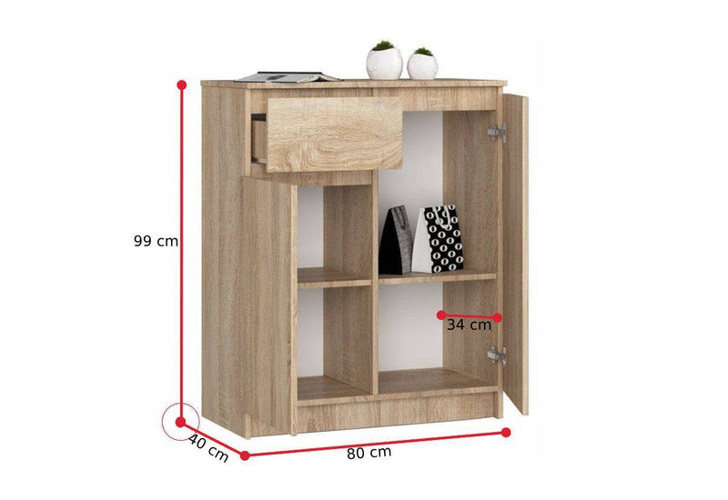 Komoda GIADA K80 2D1SZ. Je vyrobená z kvalitného materiálu hrúbky 16 mm. To pred mechanickým poškodením a vlhkosťou chráni hrana ABS. Komoda sa skladá z dvoch veľkých skriniek a jednej menšej zásuvky. Skrinky sú rozdelené policou pre prehľadnejšie usporiadanie vecí. K dispozícii je vo viacerých dekoroch.