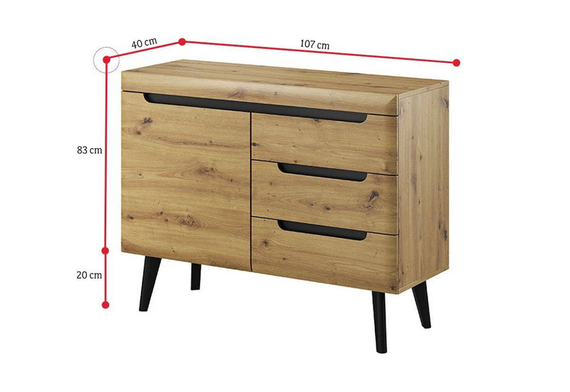 Komoda GLUM NKSZ107. Je vyrobená z kvalitného materiálu opatreného ABS hranami. Tie chránia pred mechanickým poškodením a vlhkosťou. Komoda poskytuje dostatok úložného priestoru v podobe troch zásuviek a jednej skrinky, ktorá je rozdelená policou. Kombinácia rôznych dekorov na nožičkách vyzerá vkusne a elegantne.