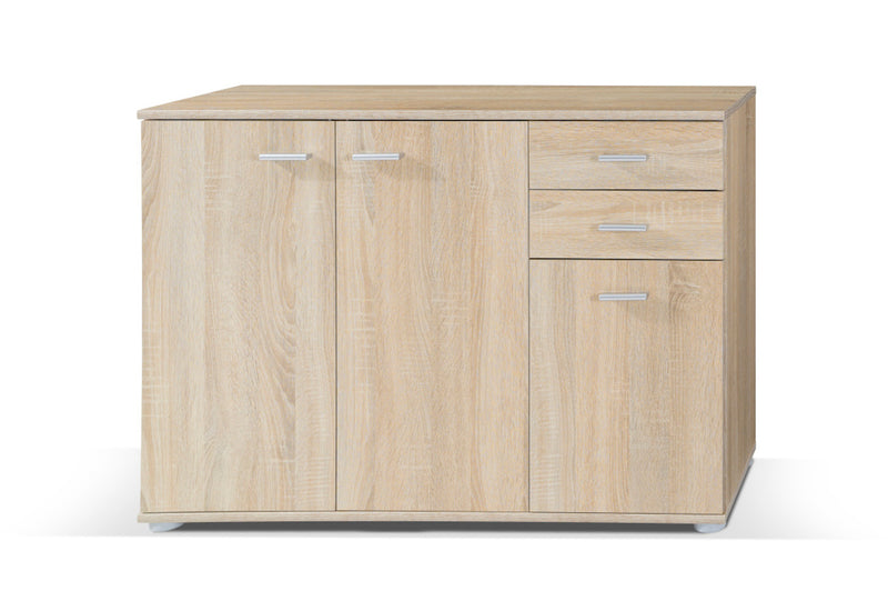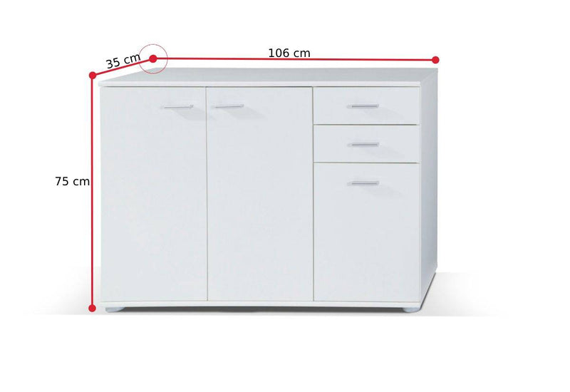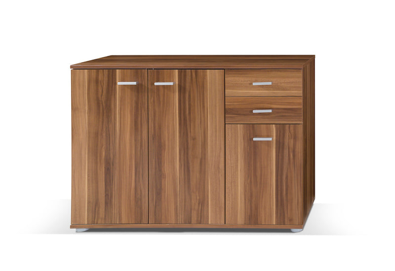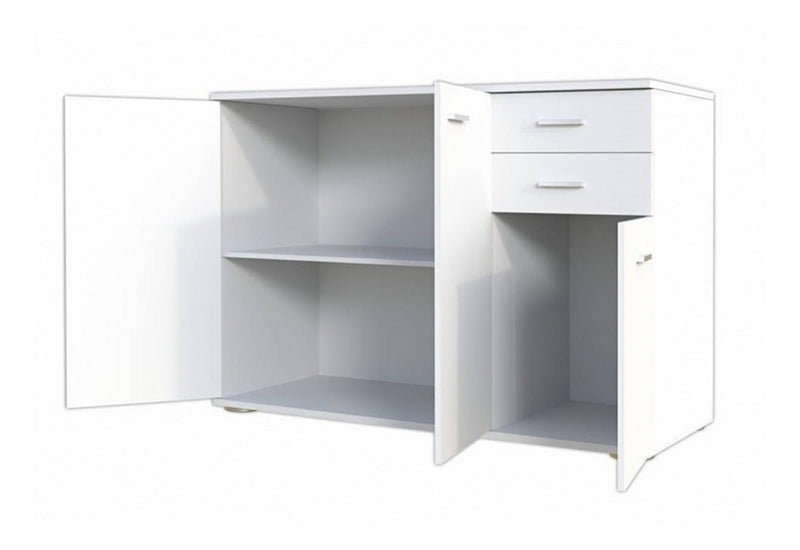 Komoda JEFF 1. Je vyrobená z vysoko kvalitného materiálu. Úložný priestor tvorí kombinácia troch malých skriniek s dvierkami a dvoch zásuviek. Dvierka i zásuvky sú opatrené úzkymi úchytmi. Dostatok priestoru poskytuje aj horná doska komody. Vyberať si môžete z viacerých dekorov.