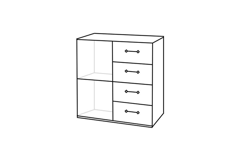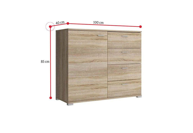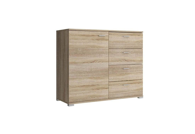 Komoda KIKI 100. Je vyrobená z kvalitného materiálu, ktoré je opatrené ABS hranami. Tie chránia pred mechanickým poškodením a vlhkosťou. Komoda poskytuje dostatok úložného priestoru v podobe štyroch priestranných zásuviek a jednej skrinky s dvierkami. Skrinka je rozdelená policou pre prehľadnejšie usporiadanie vecí. Dvierka skrinky aj zásuvky majú úzke úchyty. Komoda stojí na nízkych nožičkách. Vyberať si môžete z dvoch dekorov.