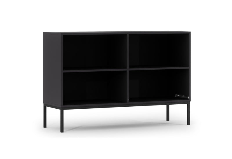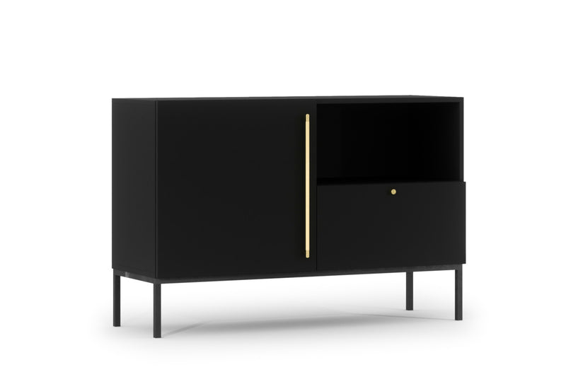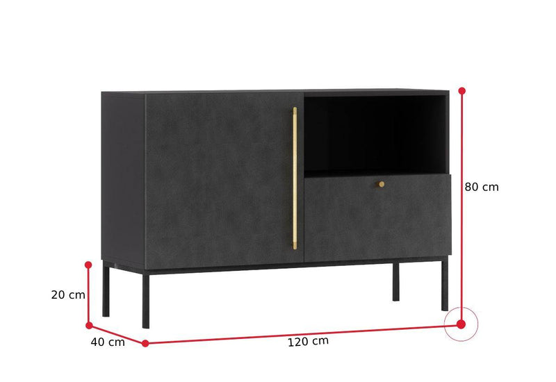 Komoda LANZA. Zaujme jednoduchým moderným dizajnom. Komoda disponuje veľkým množstvom úložného priestoru v podobe skrine, ktorá je rozdelená policou, jedným šuplíkom a otvoreným priestorom. Horná plocha poslúži aj ako odkladacie miesto. Kovové nohy zaistia pevnosť a stabilitu. Dvierka aj šuplík sú opatrené zlatými úchytmi. Vyrobená je z kvalitného materiálu s ABS hranou. ABS hrana chráni pred mechanickým poškodením a vlhkosťou. Môžete si vybrať z viacerých dekorov.