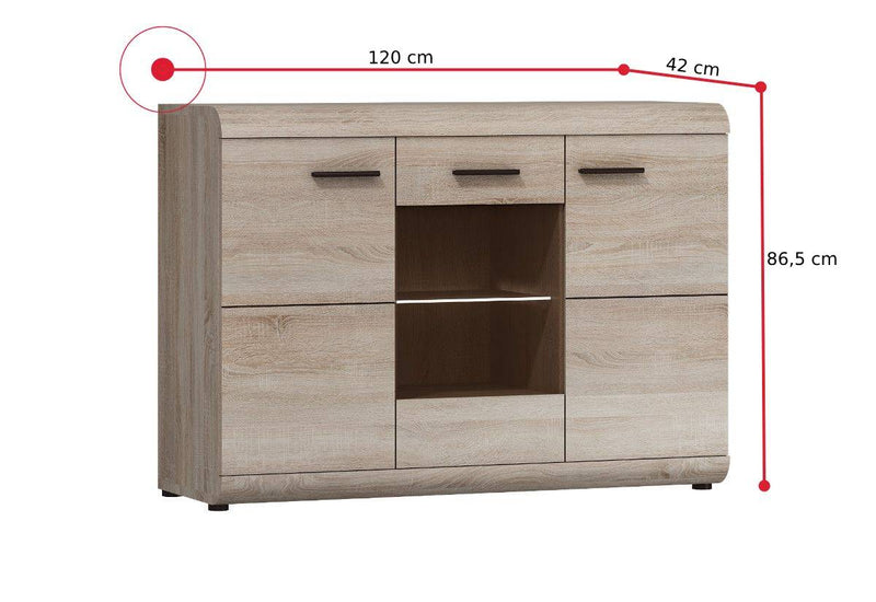 Komoda LINKEN 2. Zaujme moderným dizajnom a kvalitným spracovaním. Je vyrobená z kvalitného materiálu a opatrená ABS hranami, ktoré chránia pred mechanickým poškodením a vlhkosťou. Komoda ponúka množstvo úložného priestoru v podobe troch skriniek s dvierkami. Časť prostredných dvierok je presklená. Skrinky sú rozdelené policami a sú opatrené úchytmi. Kombinovať môžete s ďalšími produktmi z radu LINKEN.