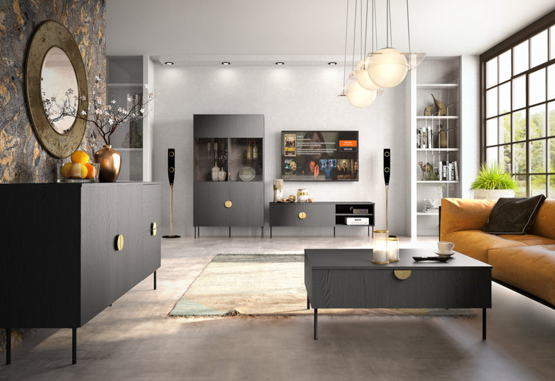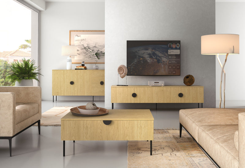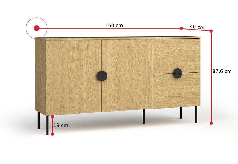 Komoda LOND. Zaujme moderným dizajnom a kvalitným spracovaním. Je vyrobená z kvalitného materiálu a opatrená ABS hranami, ktoré chránia pred mechanickým poškodením a vlhkosťou. Komoda ponúka množstvo úložného priestoru v podobe skrinky s dvierkami, ktorá je rozdelená policou a dve zásuvky. Stojí na kovových čiernych nožičkách, ktoré zaručia stabilitu a vzdušnosť. Kombinovať môžete s ďalšími produktmi z radu LOND.