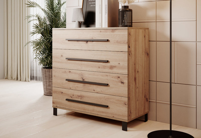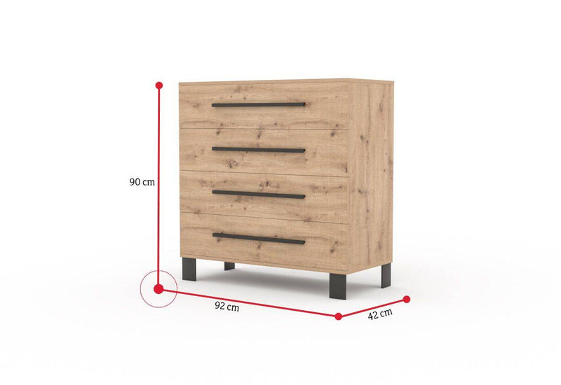 Komoda MAKLEN. Vyrobená je z kvalitného materiálu s hrúbkou 1,6 cm. Komoda sa skladá zo štyroch zásuviek, ktoré vytvárajú dostatok úložného priestoru. Čelá zásuviek sú opatrené úzkymi úchytmi. Celá konštrukcia je postavená na vyšších nožičkách, ktoré dodajú komode stabilitu a vzdušnosť.