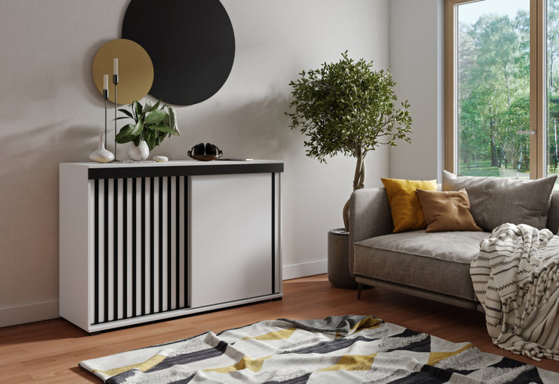 Komoda MILANY. Komoda Vás na prvý pohľad zaujme jednoduchými modernými líniami. Je vyrobená z kvalitného materiálu s hrúbkou 1,6 cm. Komoda je tiež vybavená ABS hranou, ktorá chráni materiál pred poškodením. Za posuvnými dverami sa ukrýva dostatok úložného priestoru v podobe priestranných polic. Možnosť voľby rozmeru a dekoru.