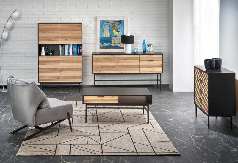 Komoda MIRANO 3. Moderná priestranná komoda v kombinácii dekoru dreva a čiernej farby vyzerá veľmi elegantne. Komoda je vyrobená z kvalitnej dyhovanej dosky. Komoda ponúka dostatok úložného priestoru v podobe štyroch skriniek s dvierkami. Skrinky sú rozdelené policami pre prehľadnejšie usporiadanie vecí. Komoda stojí na vyšších nožičkách pre väčšiu stabilitu a vzdušnosť. Odporúčame kombinovať s ďalšími produktmi z radu MIRANO.