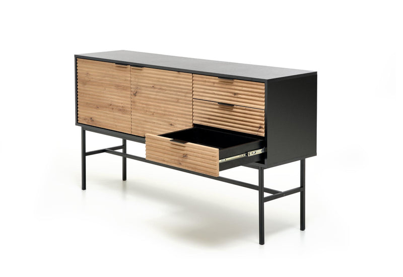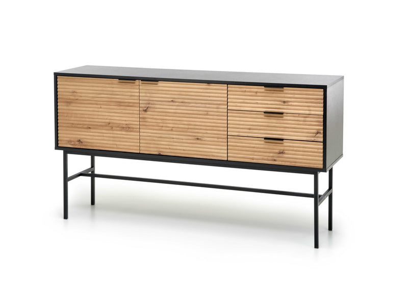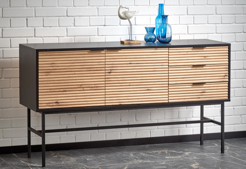 Komoda MIRANO. Moderná kombinovaná komoda v kombinácii dekoru dreva a čiernej farby vyzerá veľmi elegantne. Vyrobená je z kvalitnej dyhovanej dosky. Nízka komoda ponúka dostatok úložného priestoru v podobe dvoch skriniek s dvierkami a troch šuplíkov. Skrinka je rozdelená policou pre prehľadnejšie usporiadanie vecí. Vybavená je úchytmi pre ľahšie otváranie dvierok. Stojí na vyšších nožičkách pre väčšiu stabilitu a vzdušnosť. Odporúčame kombinovať s ďalšími produktmi z radu MIRANO.