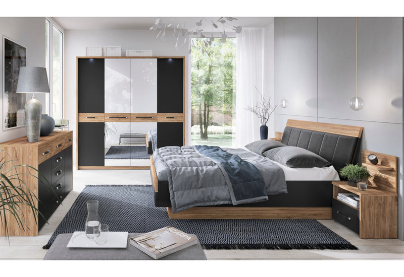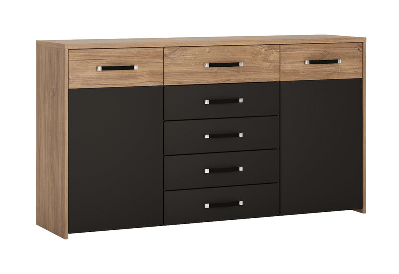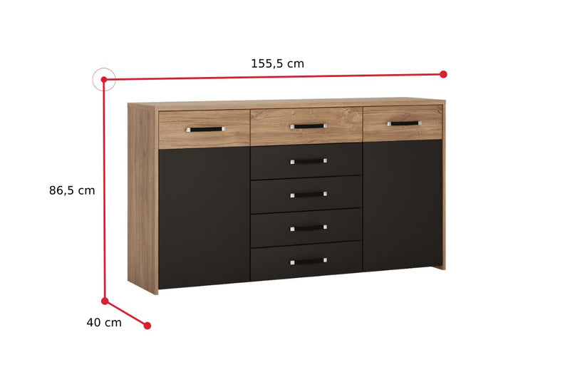 Komoda MORACO 2. Poskytuje dostatok úložného priestoru v podobe skriniek s dvierkami a piatich zásuviek. Všetky dvierka aj zásuvky majú štýlové úchytky s dizajnovým kovovým prvkom. Priestory za dvierkami sú rozdelené policami pre prehľadnejšie usporiadanie vecí. Komoda je vyrobená z kvalitného materiálu a vhodne kombinuje dekor duba stirling s matnou čiernou farbou. Odporúčame zakúpiť spolu s ďalšími produktmi z radu MORACO.