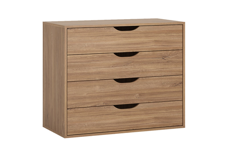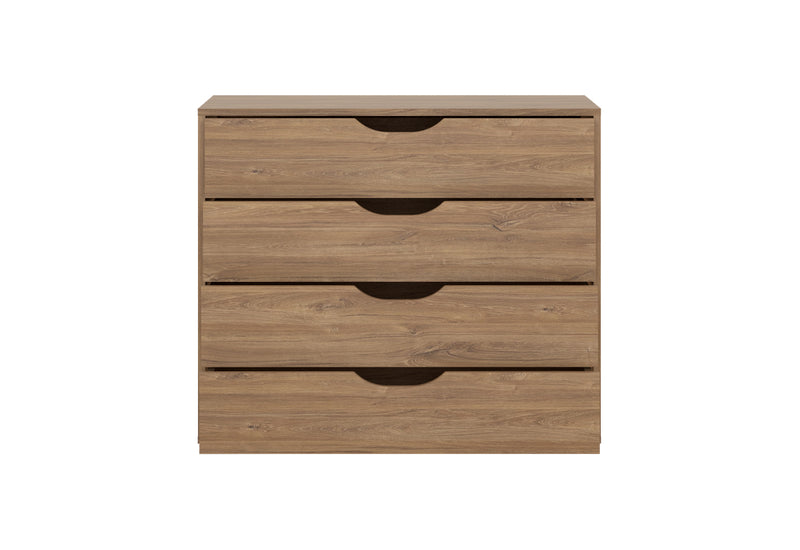 Komoda MORACO 3. Poskytuje dostatok úložného priestoru v podobe štyroch zásuviek. Zásuvky majú štýlové výrezy ako úchytky na pohodlné otvorenie. Komoda je vyrobená z kvalitného materiálu s dekorom dreva duba stirling a je vhodná na umiestnenie do skrine z tej istej kolekcie. Odporúčame zakúpiť spolu s ďalšími produktmi z radu MORACO.