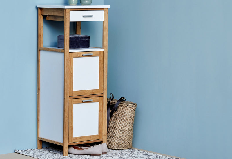 Komoda NATHALIE. Zaujme jednoduchými líniami škandinávskeho štýlu. Stojí na nižších nožičkách pre väčšiu stabilitu. Vyrobený je z udržateľného bambusu v kombinácii s MDF. Poskytuje dostatok úložného priestoru v podobe jedného šuplíka, výklopných dvierok a odkladacej plochy. Miesto si nájde v každej kúpeľni.