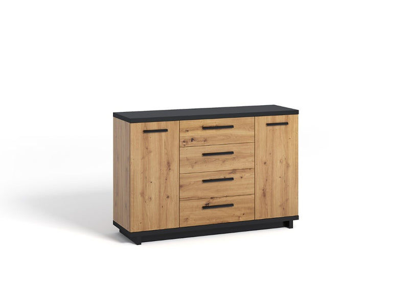 Komoda ONESIA K2D4SZ. Je vyrobená z kvalitného materiálu s ABS hranou. Tá chráni pred mechanickým poškodením a vlhkosťou. Komoda ponúka dostatok úložného priestoru v podobe štyroch zásuviek a dvoch skriniek, ktoré sú rozdelené policami. Dvierka skriniek i zásuviek sú opatrené úzkymi úchytmi.