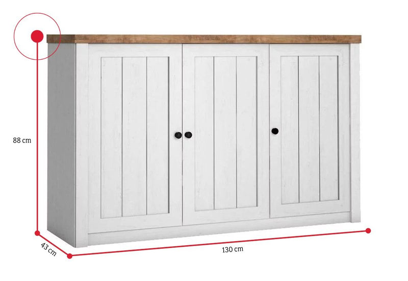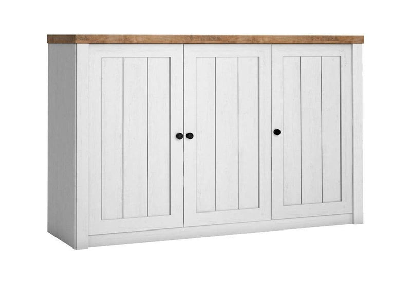 Komoda PRESS K3D. Je vyrobená z kvalitného materiálu. Komoda poskytuje dostatočný úložný priestor v podobe dvoch skriniek s tromi dvierkami. Plné dvierka vynikajú svojou palubovkové výplňou a polguľatým kovovými úchytkami. Skrinky sú vnútri rozdelené jednou policou. Dostatok miesta ponúka aj horná doska komody.