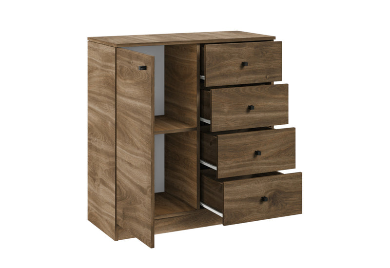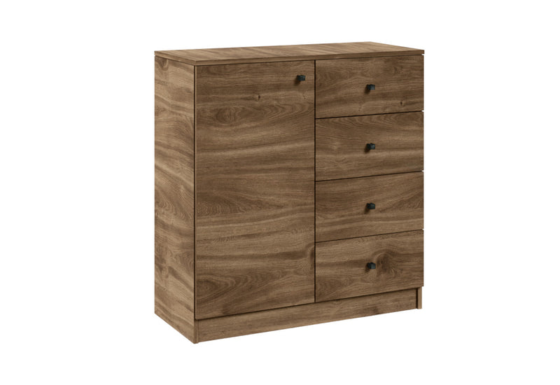 Komoda RAMORA. Zaujme jednoduchým moderným dizajnom. Je vyrobená z kvalitného materiálu, ktorý je opatrený ABS hranou. ABS hrana chráni pred mechanickým poškodením a vlhkosťou. Poskytuje dostatočné využitie úložného priestoru v podobe štyroch šuplíkov a jednej skrinky. Pre ľahšiu manipuláciu sú dvierka aj šuplíky opatrené úchytmi. Vďaka svojmu vzhľadu nájde komoda svoje miesto v každom interiéri.