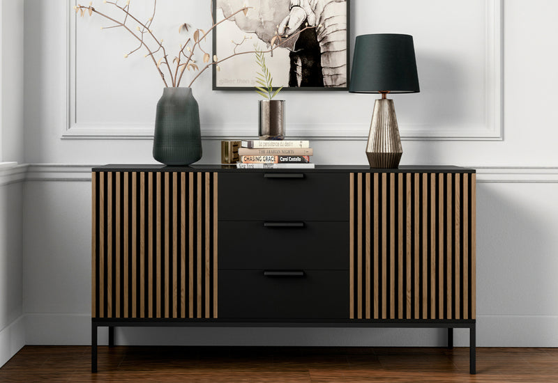 Komoda RATINA. Je vyrobená z kvalitného materiálu, zaujme svojim moderným dizajnom a je opatrená ABS hranami. Tie chránia pred mechanickým poškodením a vlhkosťou. Skrinka vhodne kombinuje dekor dreva duba artisan s matnou čiernou farbou a poskytuje úložný priestor v podobe troch zásuviek a priestoru za dvierkami. Komoda stojí na kovových nožičkách čiernej farby. Odporúčame kombinovať s ďalšími produktmi z kolekcie RATINA.