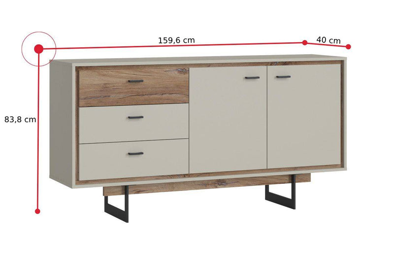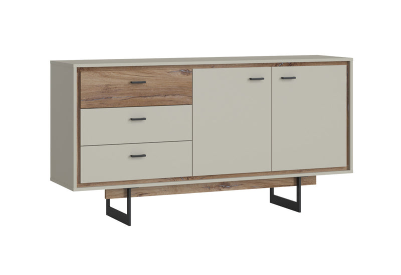 Komoda RIVAL 2. Je vyrobená z kvalitného materiálu a opatrená ABS hranami, ktoré chránia materiál pred mechanickým poškodením a vlhkosťou. Úložný priestor sa skladá z troch zásuviek a dvoch skriniek, ktoré sú rozdelené policami pre prehľadnejšie usporiadanie vecí. Stojí na vyšších kovových nožičkách v čiernej farbe. Kombinovať ju môžete s ďalšími produktmi z radu RIVAL.