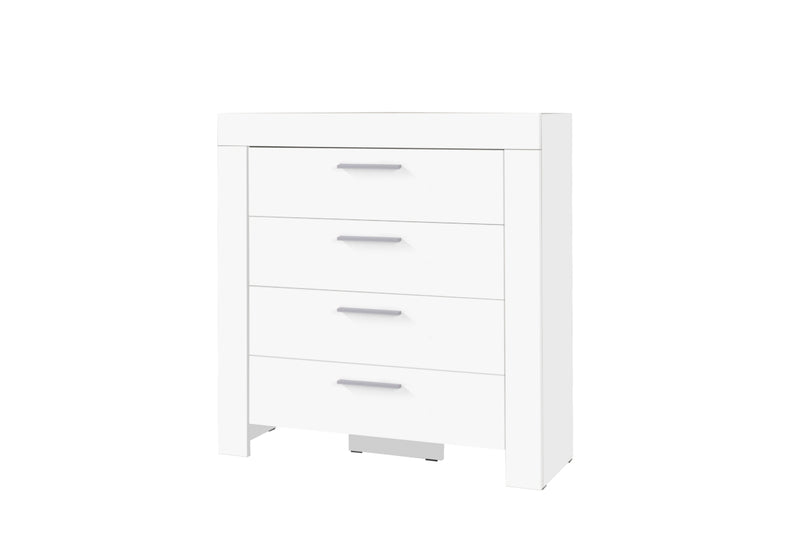 Komoda SIRO 2. Vyrobená je z kvalitného materiálu v modernom vzhľade. Komoda poskytuje dostatok úložného priestoru v podobe štyroch priestranných zásuviek, ktoré majú úzke úchytky v striebornej farbe. Odporúčame kombinovať s ďalšími produktmi radu SIRO.