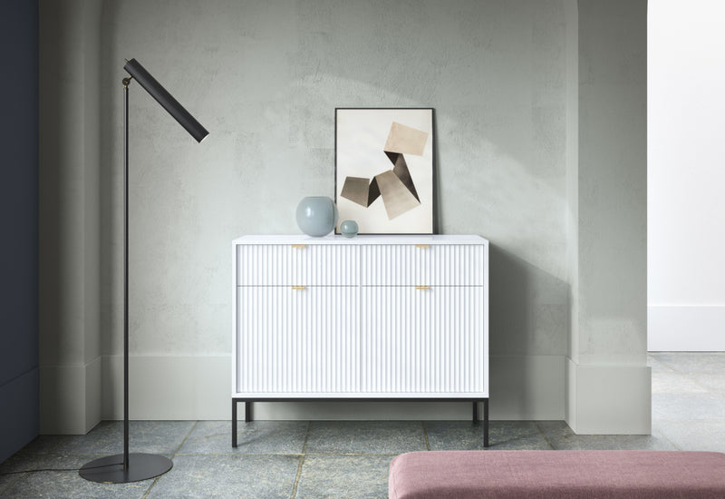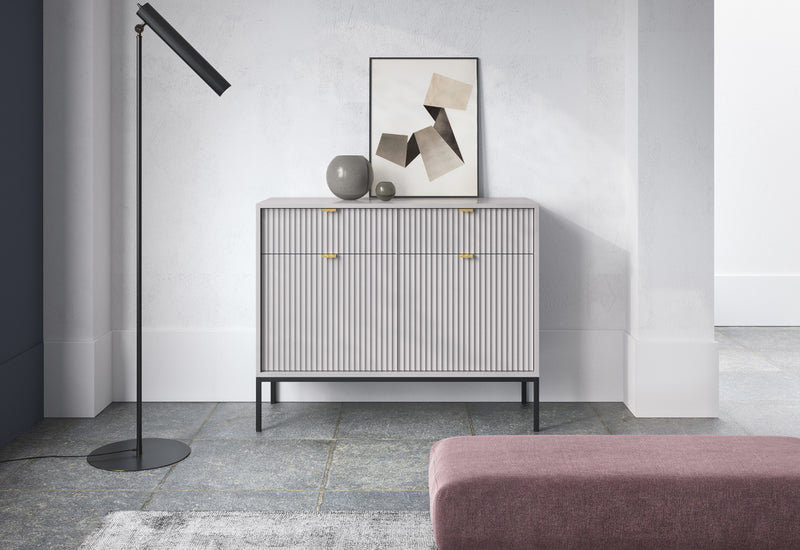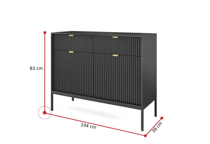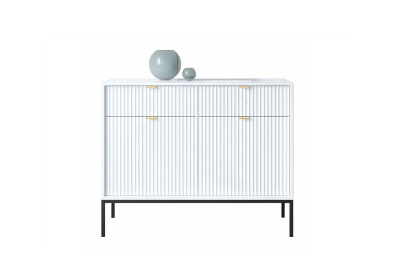 Komoda SOVA. Moderná štýlová komoda je vyrobená z kvalitného materiálu v sile 1,6 cm a 1,8 cm s ABS hranami. Súčasťou komody je úložný priestor v podobe dvoch priestranných zásuviek s dvoma skrinkami s uzatvárateľnými dvierkami, za ktorými sa nachádzajú dve poličky. Vybavená je zlatými úchytmi pre ľahšiu manipuláciu. Stojí na vysokých kovových nohách v čiernej farbe pre väčšiu stabilitu. Možnosť výberu z viacerých farebných prevedení. K dispozícii sú aj ďalšie produkty z radu SOVA.