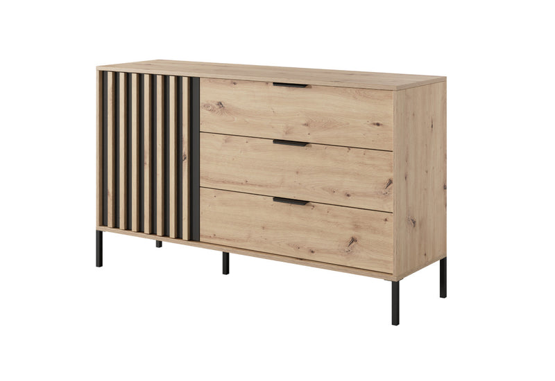 Komoda TALMA. Zaujme moderným dizajnom a kvalitným spracovaním. Je vyrobená z kvalitného materiálu a opatrená ABS hranami, ktoré chránia pred mechanickým poškodením a vlhkosťou. Komoda ponúka množstvo úložného priestoru v podobe jednej skrinky s dvierkami a troch zásuviek. Dvierka a zásuvky sú opatrené úchytmi. Kombinovať môžete s ďalšími produktmi z radu TALMA.