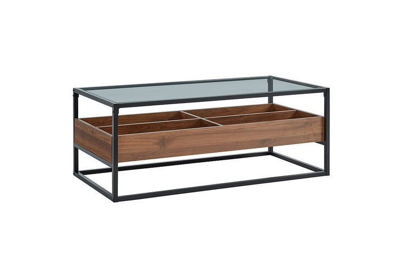 Konzolový stolík ABELO. Kombinácia materiálov v industriálnom štýle. Základ tvorí kovová konštrukcia v čiernej farbe. Tá zaisťuje pevnosť a stabilitu. Horná doska je vyrobená z pevného tvrdeného skla. V prostrednej časti sa nachádza úložný priestor so štyrmi priehradkami z kvalitného lamina v orechovom dekore. Vďaka netradičnému riešeniu ponúka praktické a funkčné využitie.