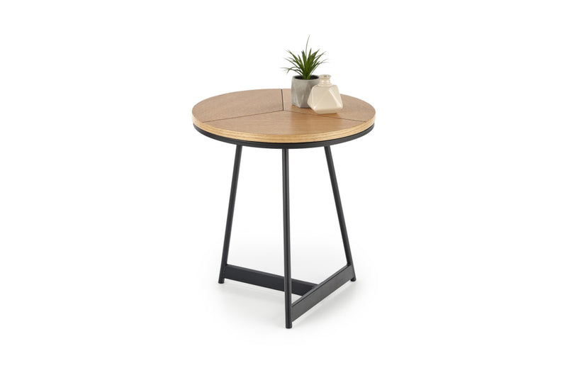 Konferenčný stolík BARTON 2. Elegantný menší konferenčný stolík v industriálnom štýle. Menšia okrúhla dyhovaná doska v dekore duba je esteticky rozdelená do troch symetrických častí. Doska je položená na spojenej trojnohej kovovej konštrukcii lakovanej v čiernej matnej farbe.