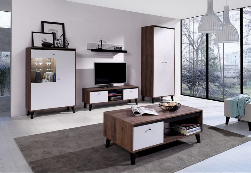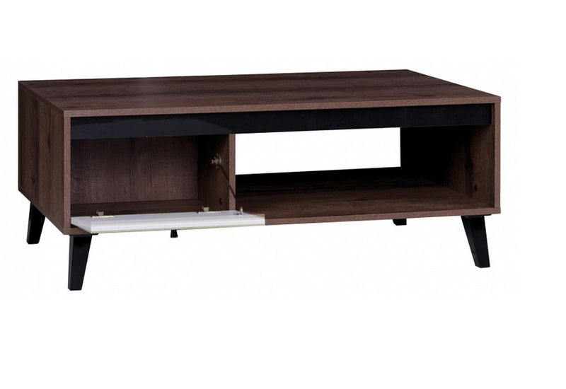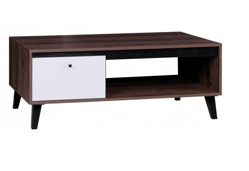 Konferenčný stolík DIVEDO OVG. Je vyrobený z kvalitného lamina hrubého 16 mm, ktoré je vystužené hranou ABS. Stabilitu mu dodávajú plastové nožičky v čiernom lesku. Pod hornou odkladacou plochou je malá skrinka s farebnými dvierkami, vedľa je otvorená zásuvka. Dvierka skrinky sú v lesklom prevedení.