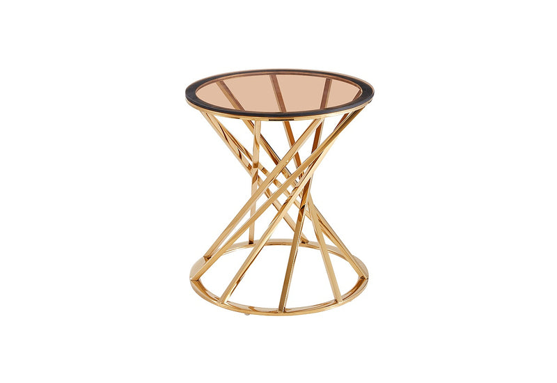 Konzolový stolík EVIE B. Zapôsobí na vás svojím moderným dizajnom. Pozostáva z pevnej kovovej konštrukcie v zlatej farbe. Stolová doska z tvrdeného jantárového skla dodáva interiéru nádych luxusu. Netradičný tvar konštrukcie s výstuhami dodáva stolu požadovanú stabilitu a pevnosť. Tento kvalitný okrúhly konferenčný stolík vás bude tešiť dlhé roky v pohodlí vášho domova.