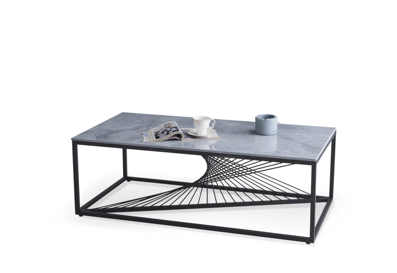 Konferenčný stolík FONETA PLUS II. Industriálny vzhľad dodáva konferenčnému stolíku originálne riešená kovová konštrukcia v čiernej farbe, ktorá zaisťuje pevnosť a stabilitu. Obdĺžniková horná doska je vyrobená z kameňa v dekore šedého mramoru. Vďaka svojim rozmerom ho využijete aj v menších obývacích priestoroch.
