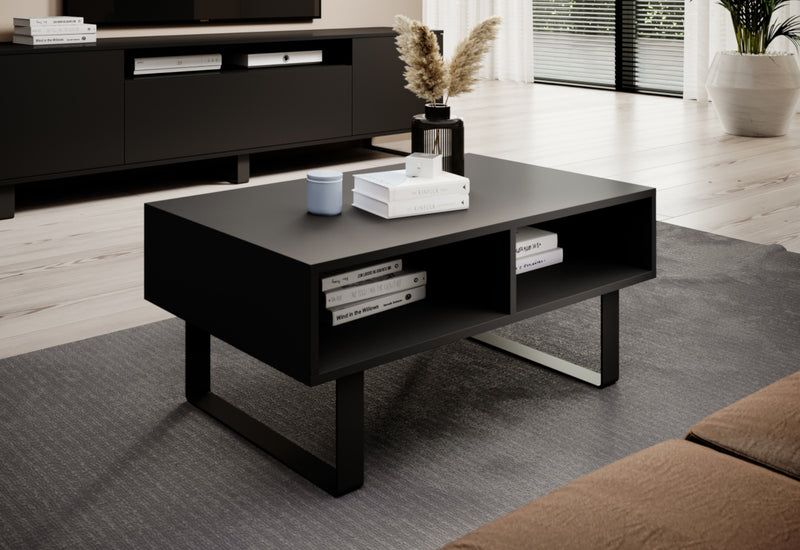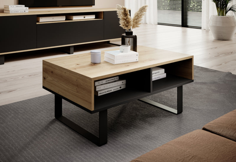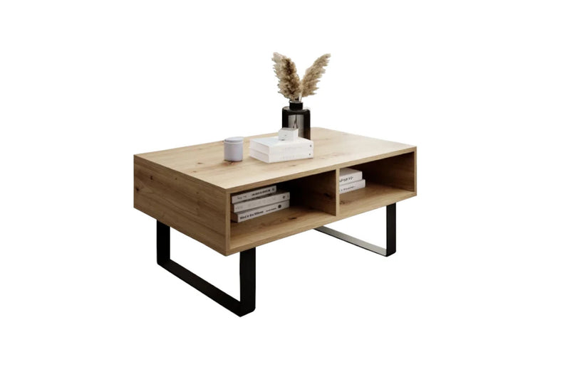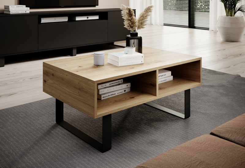 Konferenčný stolík GALA. Ponúka klasické prevedenie v modernom štýle. Vyrobený je z kvalitného materiálu s ABS hranou. Tá zaistí ochranu pred mechanickým poškodením a vlhkosťou. Horná priestranná odkladacia plocha je doplnená o otvorené police. Vďaka svojmu jednoduchému spracovaniu ho ľahko zladíte v interiéri. Elegantný vzhľad dodávajú stolíku vyššie kovové nožičky v čiernej farbe.