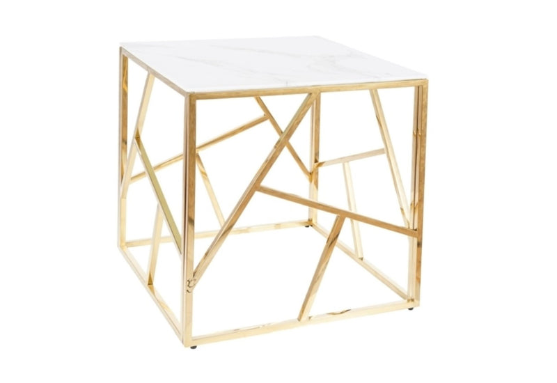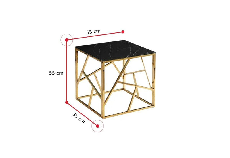 Konferenčný stolík KAPPA B II. Moderný štýl s dekorom mramoru v kombinácii so zlatom pôsobí veľmi elegantne. Nohy stolíka sú vyrobené z nerezovej ocele a doska z tvrdeného skla. Netradičný tvar nožičiek s výstuhami dodávajú štvorcovému stolíku požadovanú stabilitu a pevnosť.