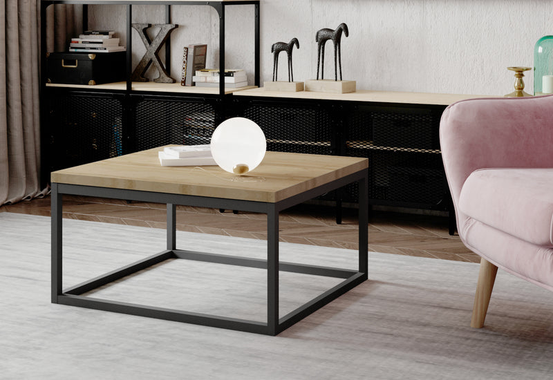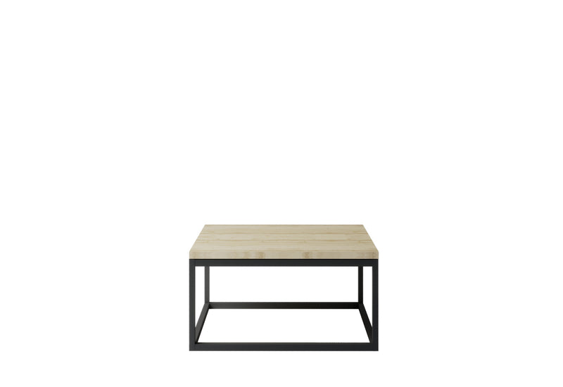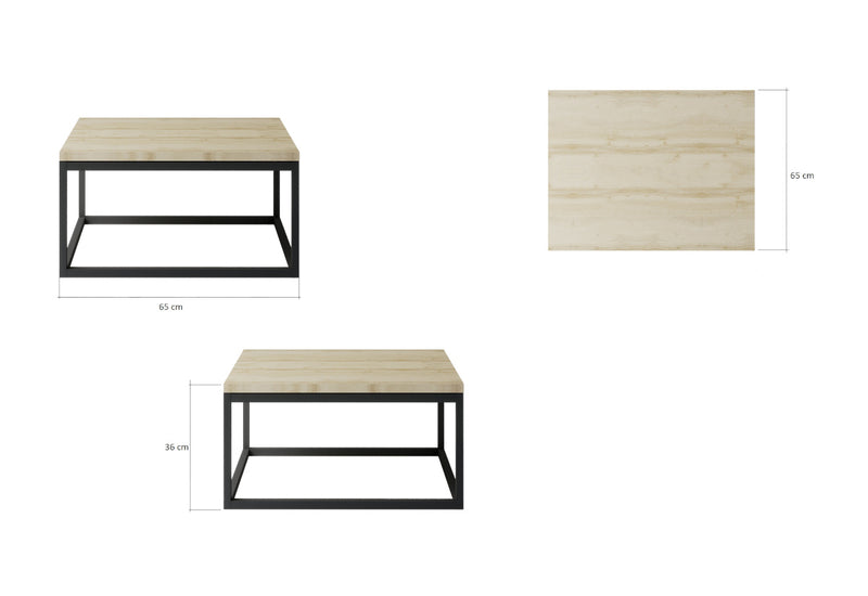 Konferenčný stolík KATE. Základ tvorí kovová konštrukcia v čiernej farbe, ktorá zaistí pevnosť, stabilitu a zároveň pôsobí odľahčene a vzdušne. Doska stolíka je v dekore dub sonoma. Priestranná odkladacia plocha s ľahko umývateľným povrchom je vyrobená z kvalitného materiálu hrúbky 1,8cm.